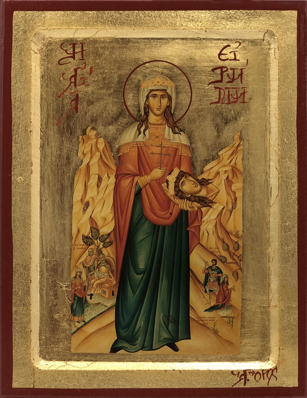 Η Αγία Ειρήνη η Μεγαλομάρτυς έζησε μέχρι τον 4ο αιώνα. Ήταν από τη Μαγεδών, κόρη του τοπικού άρχοντα Λικινίου.Το αρχικό όνομά της ήταν Πηνελόπη, όταν όμως ασπάσθηκε τον Χριστιανισμό βαπτίσθηκε Ειρήνη. Η Χριστιανική παράδοση αναφέρει πως ήταν εξαιρετικής ομορφιάς και μόρφωσης και με ιδιαίτερη ευφράδεια και έντονο θρησκευτικό ζήλο. Ανέλαβε ιεραποστολικά καθήκοντα στη Περσία επί Σαπώρ Α΄ όπου και υπέστη μεγάλη καταδίωξη.